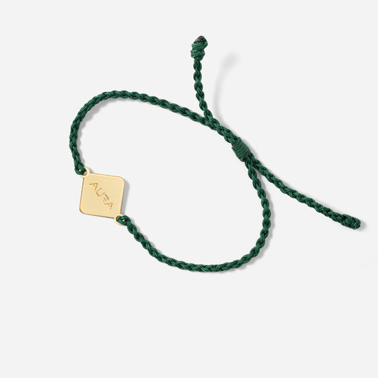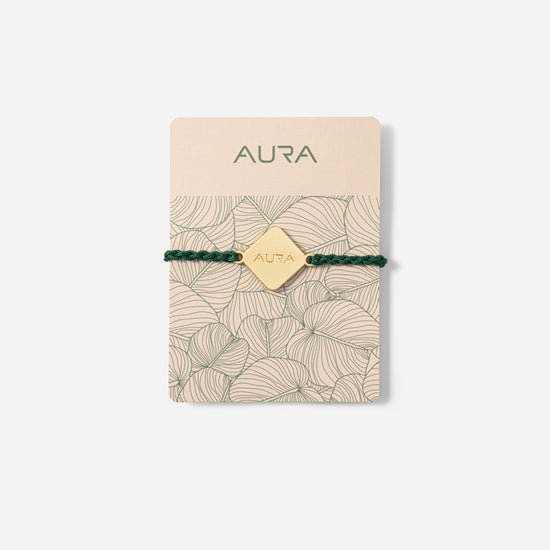 A delicate braided bracelet in green, accented with a polished gold charm engraved with AURA. Lightweight and adjustable, it exudes understated elegance, making it perfect for everyday style. A charming piece to collect and share with friends.