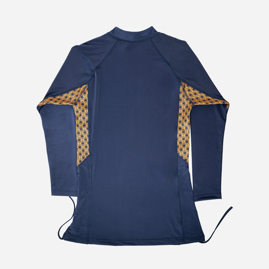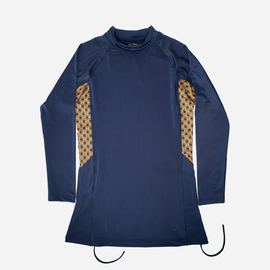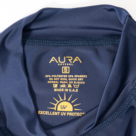 A sophisticated full-coverage swimwear set in rich Midnight Mirage, adorned with AURA’s signature monogram detailing. Lightweight, comfortable, and elegantly tailored, it offers modest coverage with a sleek, flattering silhouette - perfect for confident, effortless swim style.