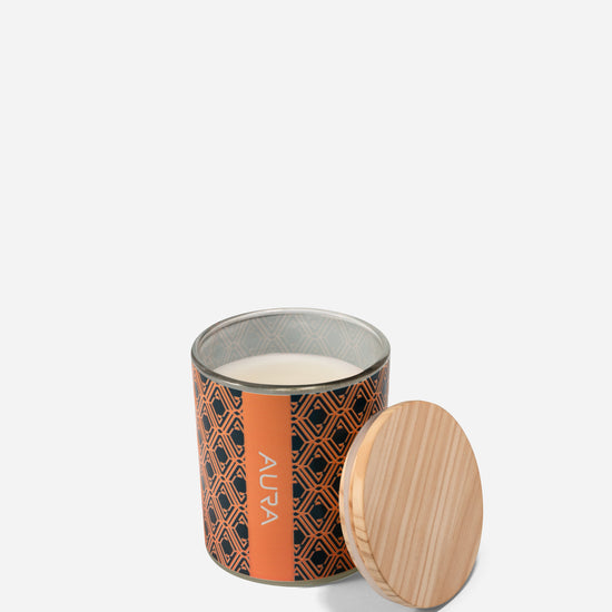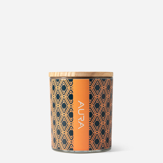 This refreshing blend of vetiver, grapefruit, and green tea is crafted to uplift, calm, and rebalance the senses. Housed in a premium AURA monogram-patterned glass with a natural wooden lid, it brings a serene ambience to any space. Perfect for everyday relaxation, home décor, or gifting.