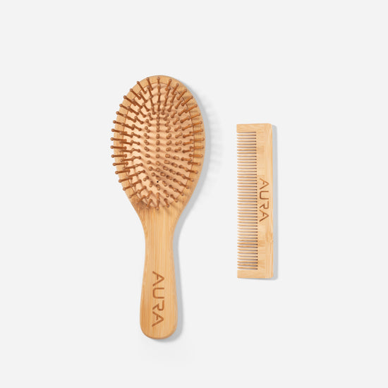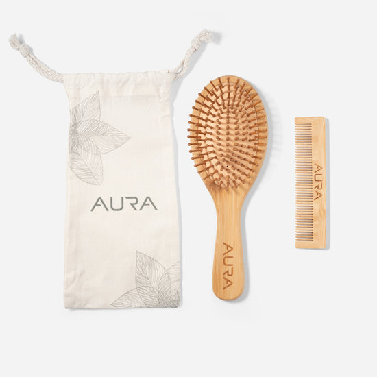 A natural, eco-friendly grooming set crafted from smooth bamboo for a gentle and comfortable brushing experience. The set includes a bamboo paddle brush and matching comb, designed to reduce static and glide effortlessly through the hair. Comes in a soft AURA pouch - perfect for daily use or travel.