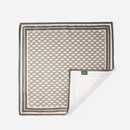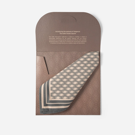 A refined pocket square showcasing AURA’s signature monogram design in a rich grey shade. Crafted from smooth, lightweight fabric that folds elegantly, it adds a polished and sophisticated touch to any suit or formal look. A timeless accessory with a distinct AURA identity.