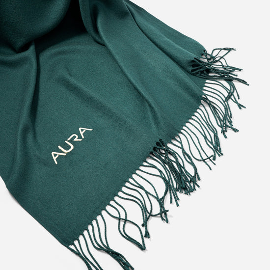 A timeless, ultra-soft pashmina in a rich Evergreen hue, featuring an embroidered AURA logo. Lightweight and elegantly draped, it’s perfect for cool evenings, travel comfort, or adding a sophisticated touch to any outfit.