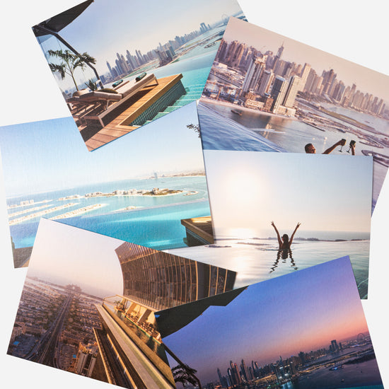 A curated collection of premium postcards featuring stunning AURA views and iconic Dubai scenes. Printed on high-quality textured paper for a refined finish, each card captures a moment of resort beauty - perfect for gifting, collecting, or sending a thoughtful note from your AURA experience.