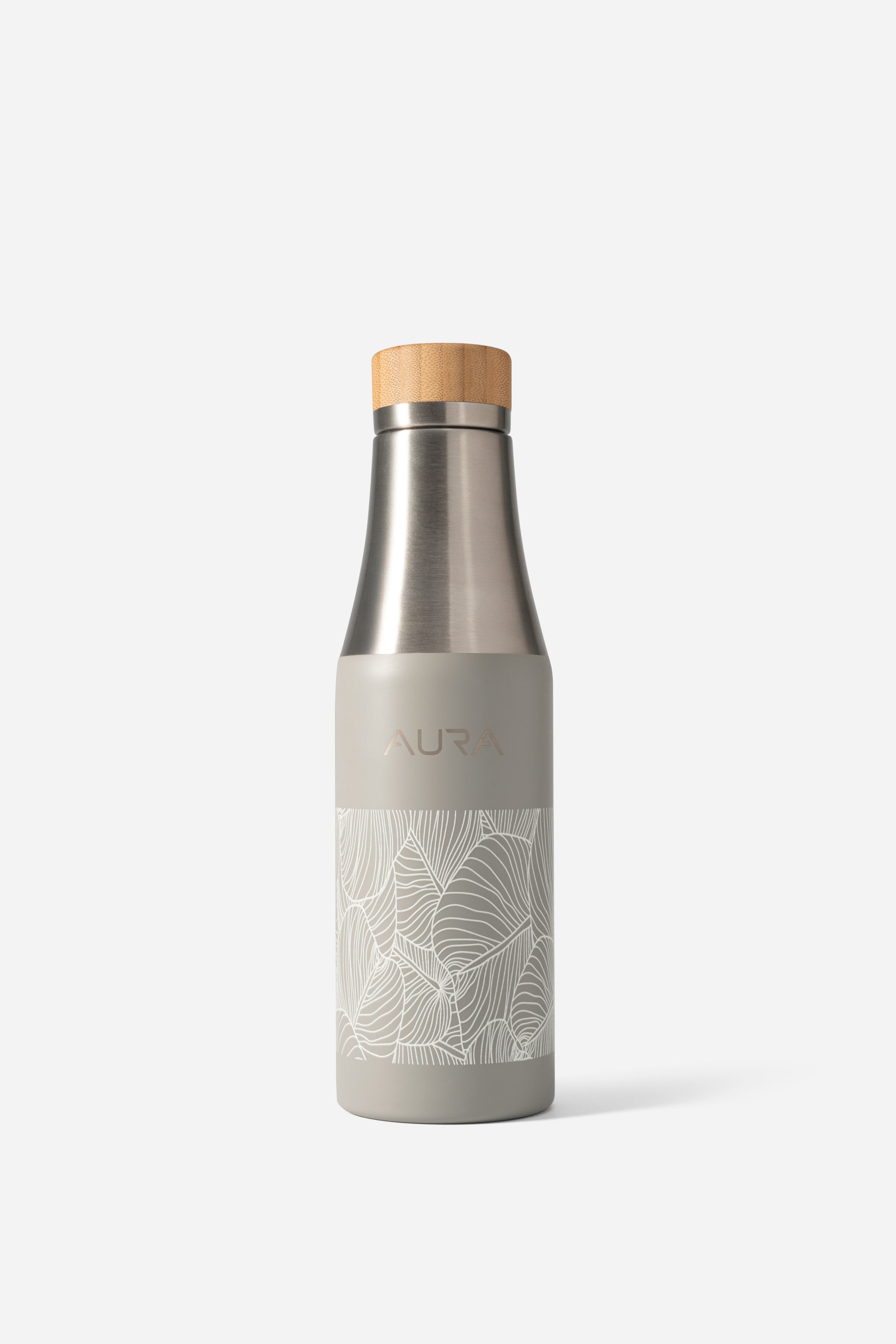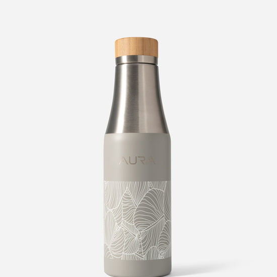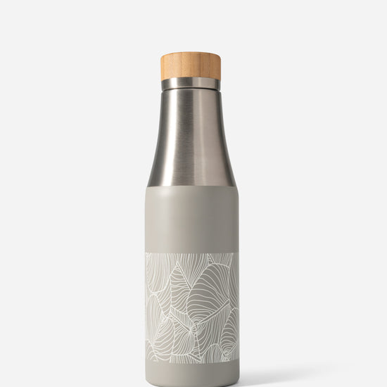 A sleek, insulated stainless steel bottle in a crisp Charcoal Grey finish, adorned with our signature palm leaves design. Keeps drinks cold or warm for hours, blending modern style with everyday practicality - ideal for travel, the gym, or poolside refreshment.