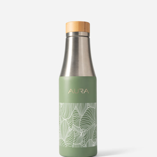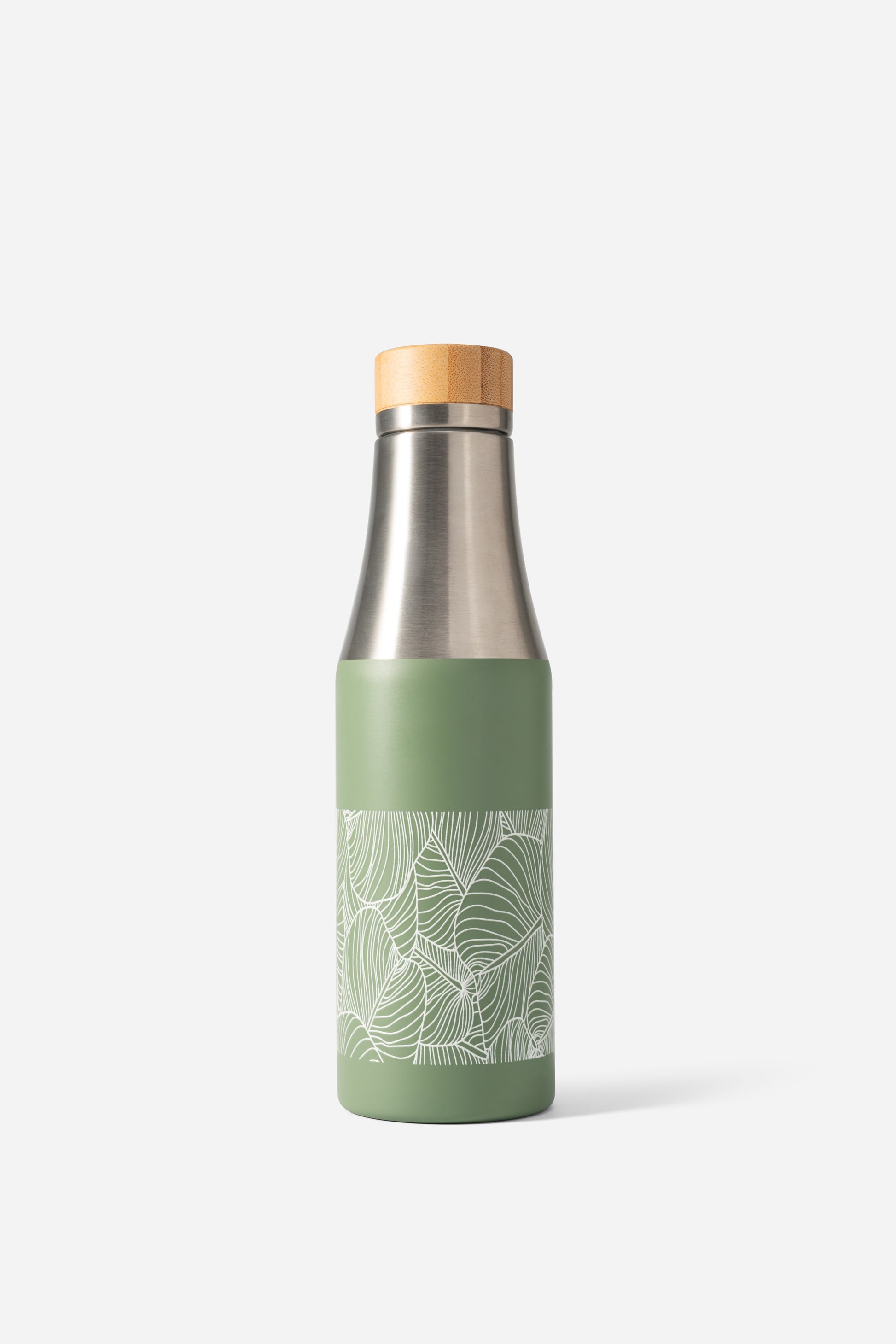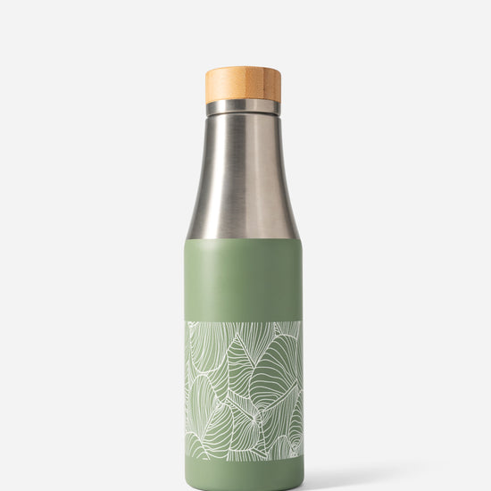 A sleek, insulated stainless steel bottle in a crisp Olive Green finish, adorned with our signature palm leaves design. Keeps drinks cold or warm for hours, blending modern style with everyday practicality - ideal for travel, the gym, or poolside refreshment.