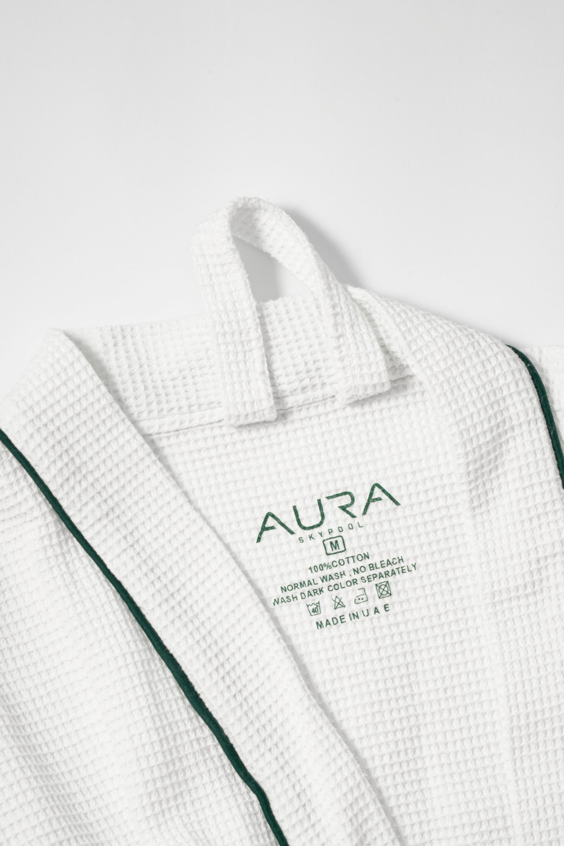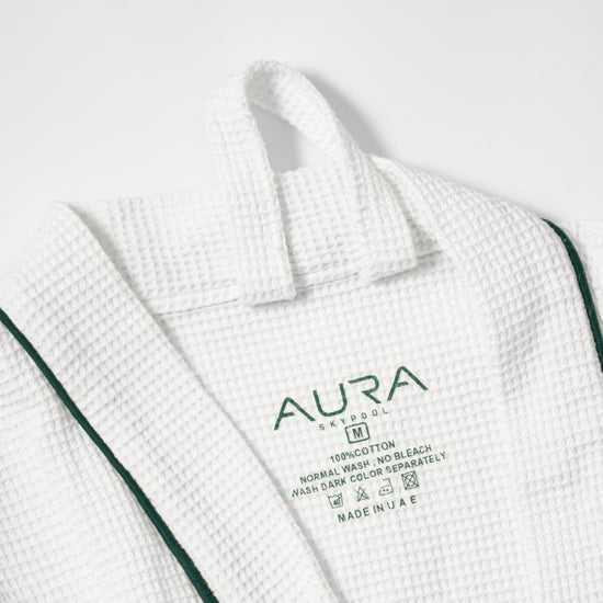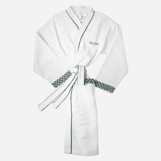 Experience understated luxury with our premium waffle robe, crafted for effortless comfort and refined lounging. Featuring AURA’s signature evergreen monogram detailing, this lightweight yet plush robe brings a touch of elegance to your daily rituals. Perfect for relaxing moments, gifting, or elevating your home-spa experience.